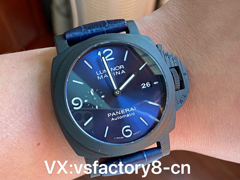 4:VS廠這款沛納海1664復(fù)刻表的表盤采用了午夜藍(lán)表盤,盡顯大氣。 在碳纖維材質(zhì)的映襯下,泛著深邃藍(lán)色光澤的表盤更顯動人美感。表盤上倏忽不定的光影變幻,仿佛陽光穿透深海折射出的氤氳光芒,VS廠沛納海1664三明治式表盤上點(diǎn)綴數(shù)字及小時標(biāo)示,并搭配黑色精鋼指針,均涂覆白色SuperLumiNova?夜光涂層,在黑暗環(huán)境中以綠色夜光顯示,與藍(lán)色表盤形成鮮明對比,而在指針的設(shè)計上,VS廠也非常講究,力求在形狀和比例上與正品保持一致。