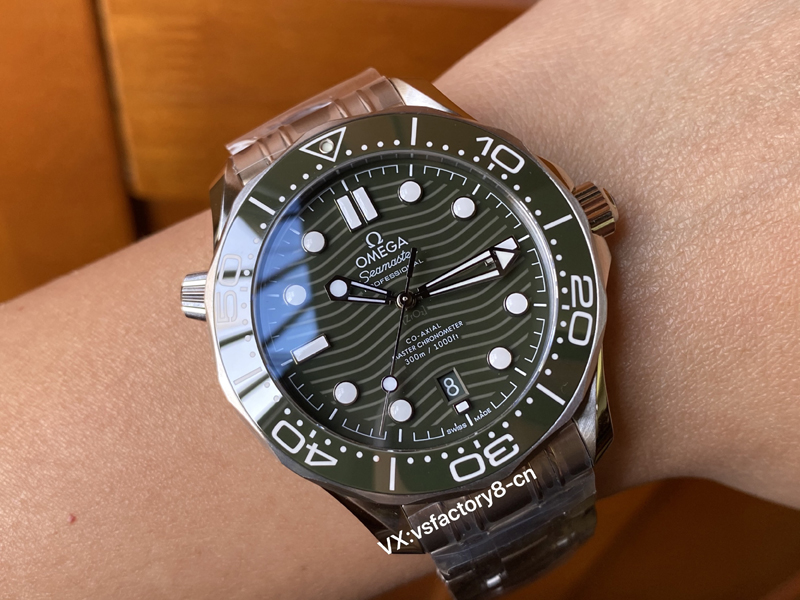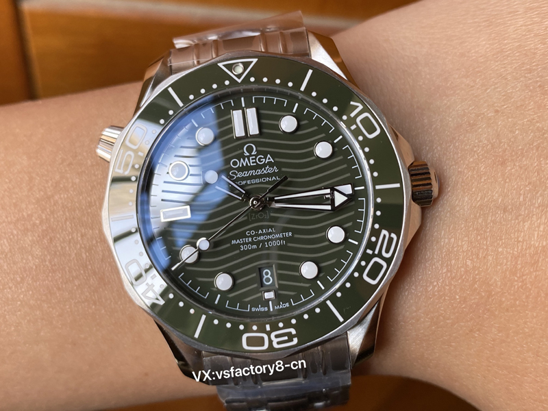 3:VS工廠購入了歐米茄綠面海馬300米正品開版,表圈上,同步了正品一致綠色陶瓷表圈,飾以白色琺瑯潛水刻度,字圈刻度不易磨損掉色,棘輪式倒計時表圈逆時針單向轉動。表盤這方面,拋光綠色陶瓷表盤,激光鐫刻波紋圖案,6點鐘位置設有日歷窗口,鏤空指針和浮雕小時刻度經鍍銠處理,并覆以Super-LumiNova夜光涂層,藍綠雙色夜光,分針綠色夜光顯示配合表圈綠色夜光點用于潛水氧氣倒計時。