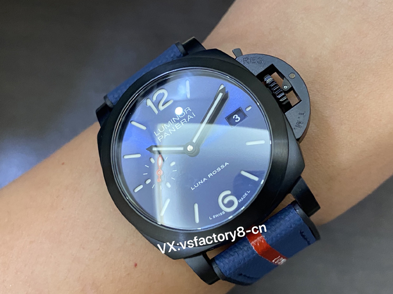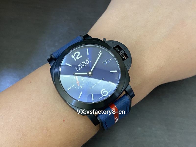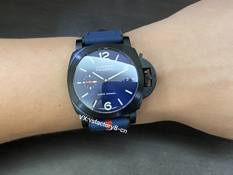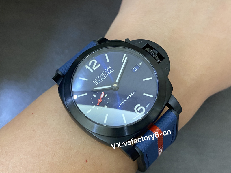 4:VS廠沛納海PAM1408的表盤(pán)設(shè)計(jì)從來(lái)都是人們津津樂(lè)道的話題,VS廠還原正品藍(lán)色設(shè)計(jì)還原,其不存在有很大的色差,也看不出一眼假和破綻,九點(diǎn)位置設(shè)有小秒針盤(pán),三點(diǎn)位置設(shè)有日歷窗,其經(jīng)典的“三明治”規(guī)格設(shè)計(jì),值得注意的是小秒針盤(pán)則是采取了紅色小秒針,大大增加了很大的顏值,表盤(pán)上的標(biāo)志性阿拉伯?dāng)?shù)字以及經(jīng)典的指針布局,在復(fù)刻版中得到了忠實(shí)再現(xiàn)。