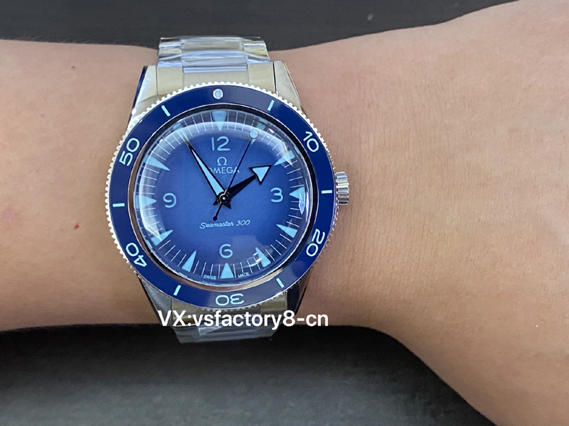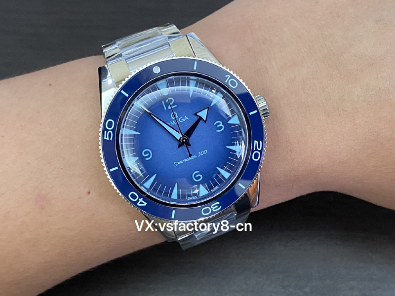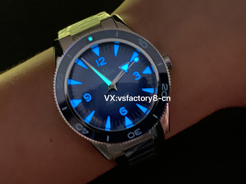 4:VS廠冰藍(lán)面海馬300復(fù)刻腕表,其表盤的顏色柔和而富有層次感,采用“三明治”表盤的設(shè)計理念,鏤空的小時刻度和數(shù)字時標(biāo)讓表盤下層的淺藍(lán)色夜光涂層效果更為立體明顯,簡潔的表盤飾有品牌標(biāo)識與“Seamaster 300”字樣,冰藍(lán)色的表盤上,時標(biāo)和指針的設(shè)計一絲不茍。復(fù)刻版在指針的形狀和長度上均嚴(yán)格對照正品,細(xì)膩的打磨工藝使得指針在光的照射下閃爍著迷人的光澤,還原了正版一致廣受歡迎的“棒棒糖”型中央秒針。鍍銠指針、鏤空的小時刻度和數(shù)字時標(biāo)均覆以獨(dú)特的淺藍(lán)色Super-LumiNova夜光涂層。