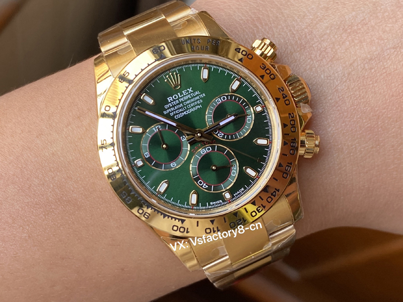 4:同時,VS廠勞力士綠金迪的表盤的英文印刷細(xì)節(jié)做工非常均勻,三個綠色計時小圓盤還原的非常細(xì)致,指針和刻度均無瑕疵現(xiàn)象,并且填充了進(jìn)口瑞士夜光粉,此外,表殼右側(cè)設(shè)有正品一致三把頭,全面經(jīng)過真空電鍍18K金,整體看起來非常有質(zhì)感,二點(diǎn)位置把頭則是計時開關(guān),三點(diǎn)位置則是調(diào)時間,上發(fā)條,四點(diǎn)位置則是計時歸為,功能完全對版,非常值得入手。