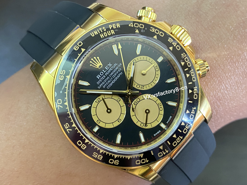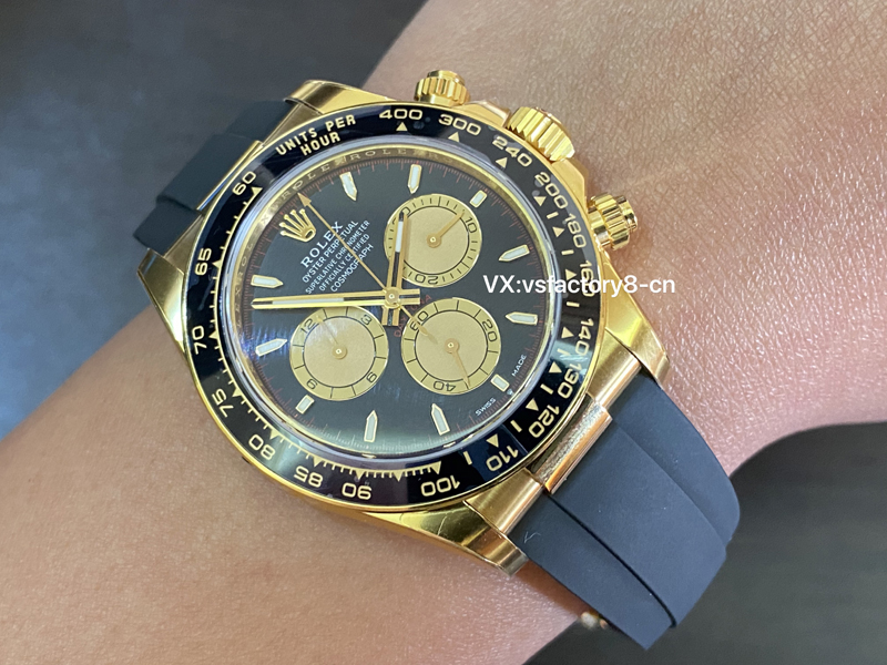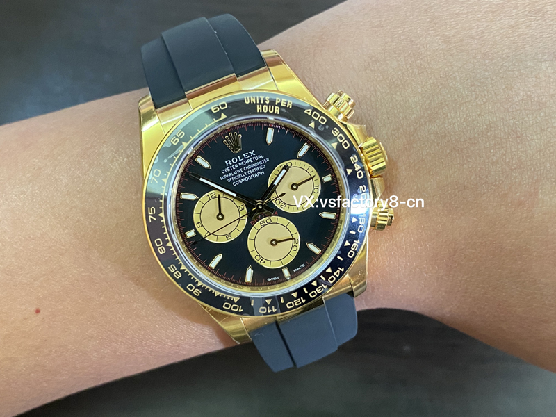 1:首先,我們來看VS廠勞力士小怪獸迪通拿丹東4131機(jī)V2版的整體外觀還原設(shè)計,VS廠小怪獸迪通拿復(fù)刻手表延續(xù)了經(jīng)典的勞力士迪通拿風(fēng)格,表殼采取了烏鋼貴金屬材質(zhì),此次VS工廠升級V2版本就是表殼增加了配重版本,整體腕表達(dá)到了136克,并且表殼的外觀進(jìn)行了真空電鍍18K金,經(jīng)過拋光與拉絲處理,展現(xiàn)出光澤感與質(zhì)感的完美結(jié)合。