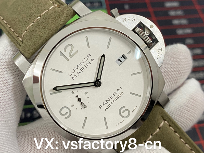 4:VS廠沛納海PAM1314的表盤是其最引人注目的地方之一,白色三明治式表盤簡約還原設計,而白色的表盤給人白凈清晰的感覺,非常良好,字母與數字采用了非常清晰的印刷工藝,表盤的三點鐘位置設有日歷窗口,邊緣經過細致打磨,整體設計雖然簡約,但也不失功能性,時針、分針均為經典的劍形設計,指針經過拋光處理,表面平滑且有光澤。在指針的末端,涂有夜光涂層,可以與表盤的時標形成協調的視覺效果。秒針使用了非常細致的設計,流暢而纖細,能精準地指示每一秒的變化。