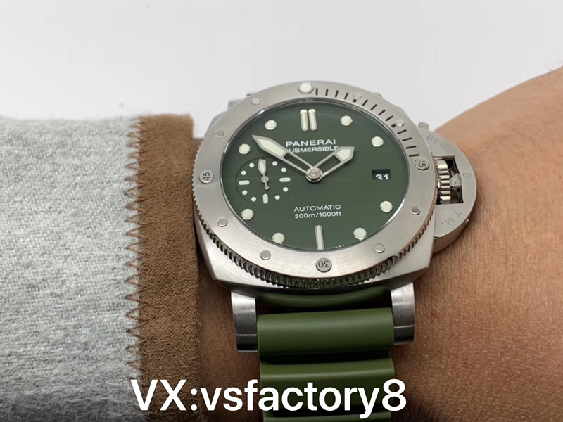4:VS廠沛納海PAM1055的表盤還原設(shè)計延續(xù)了一致正品軍綠色,在表盤9點鐘位置設(shè)有小秒盤,3點鐘位置為日歷顯示功能,名副其實的“三明治”設(shè)計,VS廠完美的復(fù)刻到位,VS廠在表盤的制作上,力求還原原廠的細(xì)節(jié),比如,表盤上的“Panerai”和“SUBMERSIBLE”字樣清晰可見,并且字體的大小和間距都與正貨完全一致。
