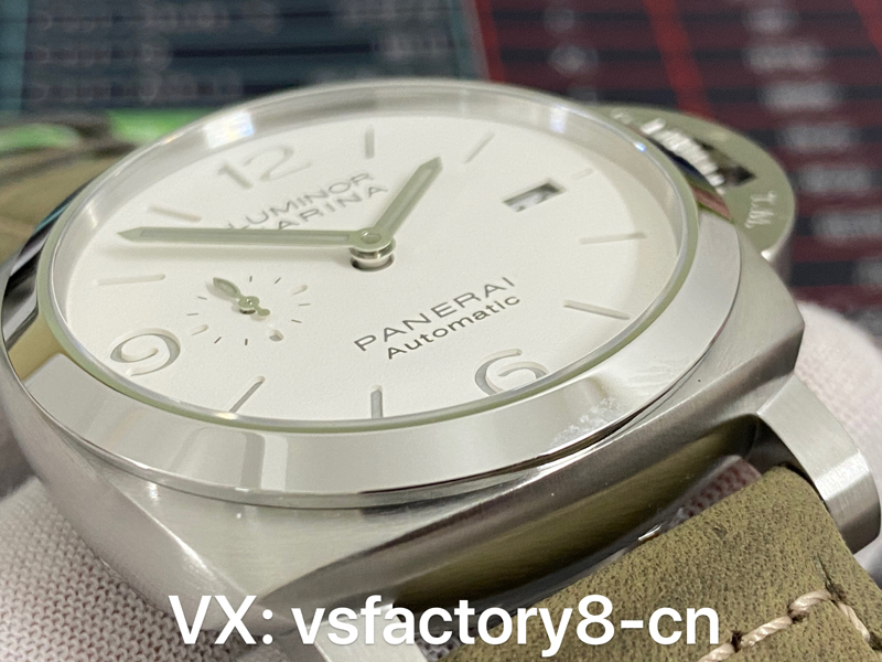 5:VS廠沛納海pam1314復(fù)刻表的表盤還原設(shè)計(jì)簡(jiǎn)潔還原最高品質(zhì),一致原版白色表盤還原,其無(wú)色差和一眼假現(xiàn)象,12、9、6的位置標(biāo)志采用阿拉伯?dāng)?shù)字,清晰易讀,表盤英文印刷細(xì)節(jié)非常精湛,具備一定的深度感,三點(diǎn)位置日歷窗,九點(diǎn)位置小秒針盤,其經(jīng)典“三明治”結(jié)構(gòu)還原,指針和刻度上填充了瑞士夜光粉涂層,VS廠在復(fù)刻時(shí)充分考慮了夜光涂層的質(zhì)量,使其在黑暗中的亮度與正品一致,足以證明VS廠沛納海pam1314是非常值得入手。