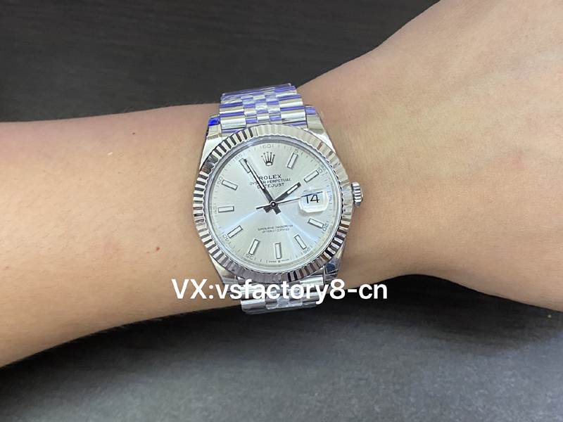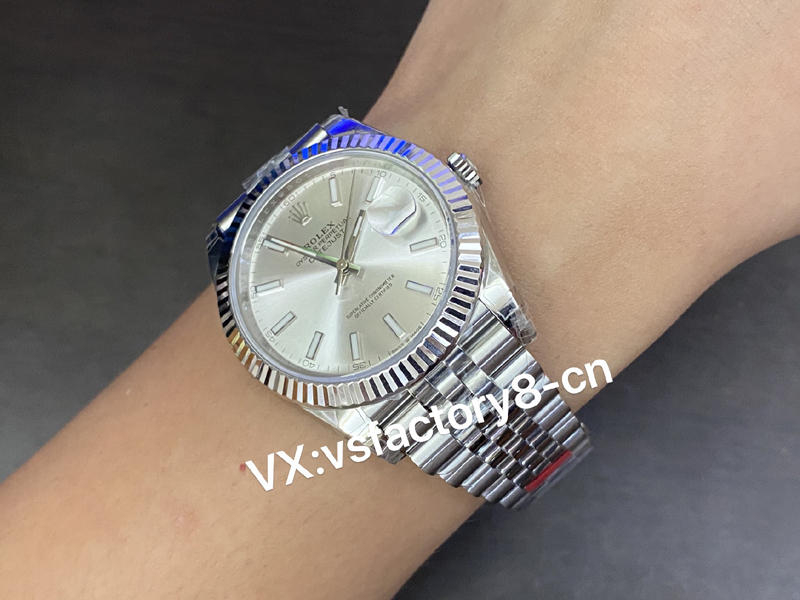 5:VS廠復刻的勞力士銀盤日志復刻表,還原與原版銀色底盤一致,表盤呈現(xiàn)出極致的光澤感,陽光下閃爍出迷人的放射紋,真正達到了最高版本,清晰度和立體感都非常出色。表盤上刻有的時標和指針均采用了瑞士夜光粉涂層效果一致,盤面英文印刷細節(jié)非常精湛,十二點大皇冠LOGO非常的立體。