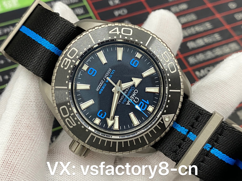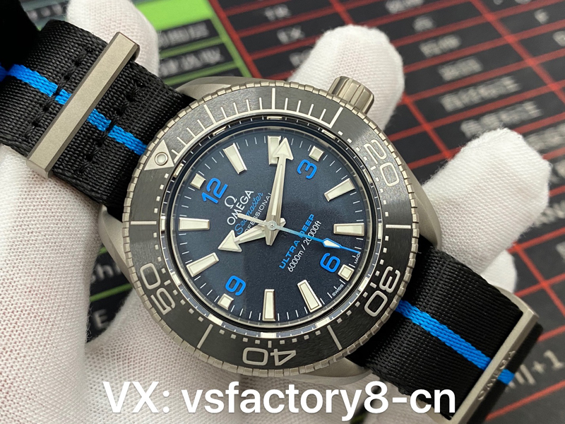 5:VS廠歐米茄鈦海王海馬600米同步原版一致黑色陶瓷的鈦金屬表盤搭配藍(lán)色數(shù)字時標(biāo)和漸變效果的藍(lán)色中央秒針,漸變的盤面搭配上炭黑色的表圈,用白色的夜光涂層來作為腕表的亮色點綴,這種細(xì)節(jié)上的雕琢,體現(xiàn)了VS廠對品質(zhì)的嚴(yán)格要求。表盤英文印刷整體細(xì)節(jié)非常立體感超強,指針和刻度均填充了瑞士夜光粉涂層,表盤上所有的做工品質(zhì)復(fù)刻的非常一步到位。