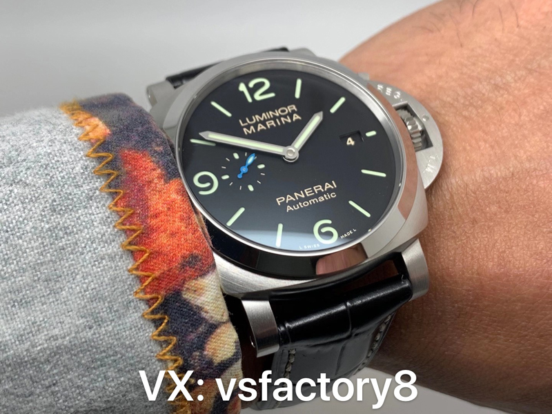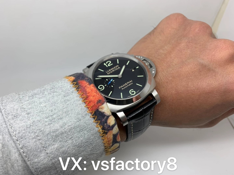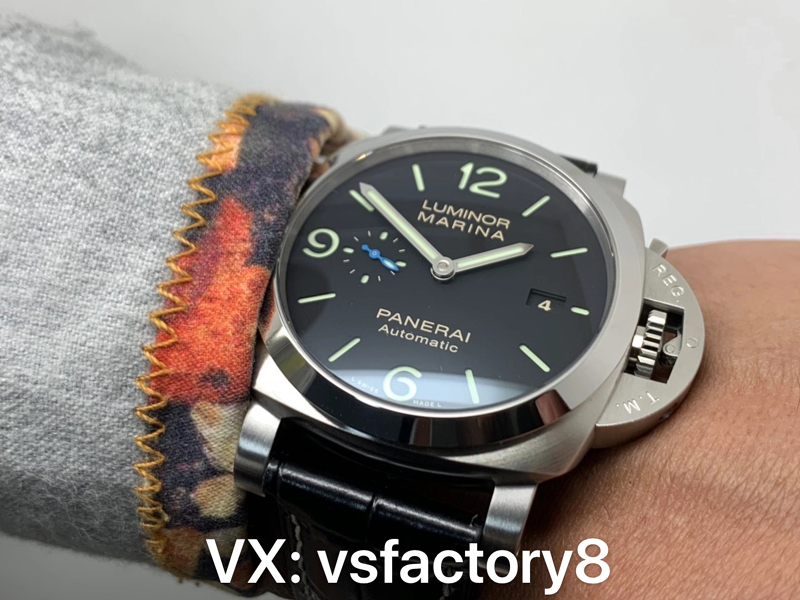4:VS廠沛納海PAM1312廬米諾系列復(fù)刻表的表盤采用原版一致經(jīng)典的黑色復(fù)刻還原設(shè)計,實施“三明治”結(jié)構(gòu)復(fù)刻,其三點位置日歷窗,九點位置小秒針盤,而最經(jīng)典采用了藍色小秒針,識別度非常清晰,表盤上的時標(biāo)與指針均采用夜光材料處理,確保在低光環(huán)境中的可讀性,VS廠在指針的制作上,力求還原原版的設(shè)計細節(jié),在夜光度與光澤度上,均勻分布的夜光涂層帶來了令人滿意的視覺效果。