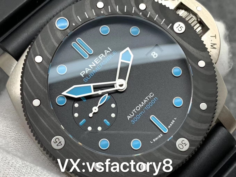 4:VS廠沛納海pam799沿用了原版一致黑色表盤復刻還原,圓形刻度和鏤空指針極具辨識度,3點鐘位置設了日期顯示窗口,9點鐘位置設了小秒盤,其原版一致“三明治”結(jié)構(gòu)復刻,表盤周圍的時標與指針都經(jīng)過特殊處理,填充了藍色夜光涂層,具有良好的夜光效果,完美撐起最高版本復刻表。