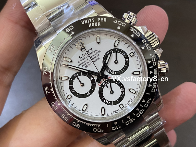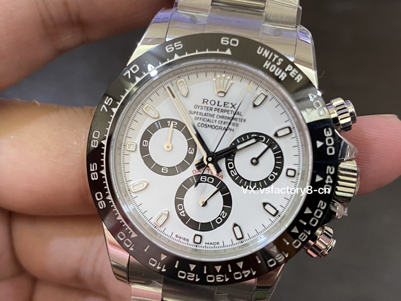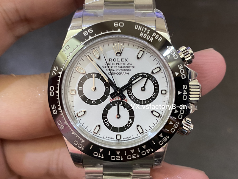 5:在表盤(pán)的復(fù)刻還原設(shè)計(jì)上,VS廠不僅忠實(shí)還原了正品的細(xì)節(jié),還在表盤(pán)方面進(jìn)行了優(yōu)化,使其在視覺(jué)上更具吸引力,一致“死白色”鍛造還原,黑色計(jì)時(shí)盤(pán)和白色表盤(pán)形成鮮明對(duì)比,被稱(chēng)為“熊貓”稱(chēng)號(hào),VS廠采取了實(shí)心中軸,十二點(diǎn)大皇冠LOGO立體強(qiáng)烈,表盤(pán)印刷細(xì)節(jié)處理的非常完美,指針和刻度均填充了瑞士夜光粉涂層,效果一致原版。