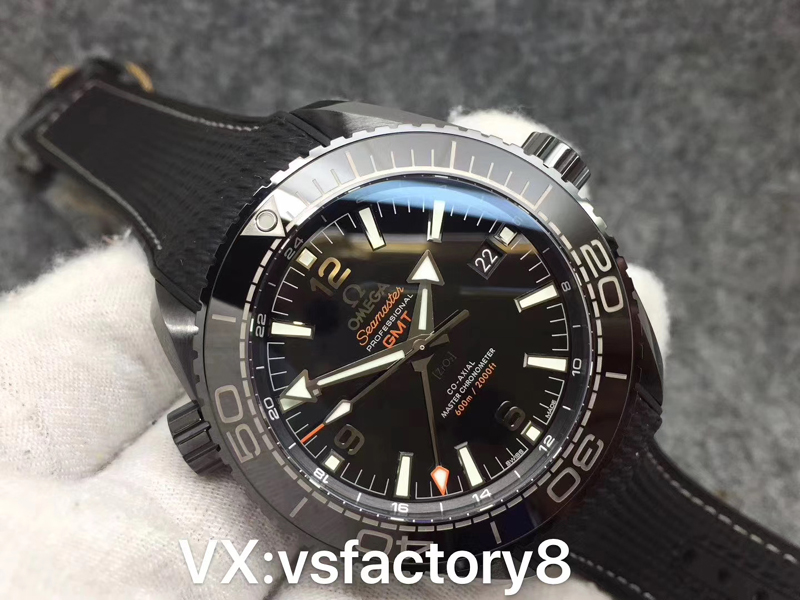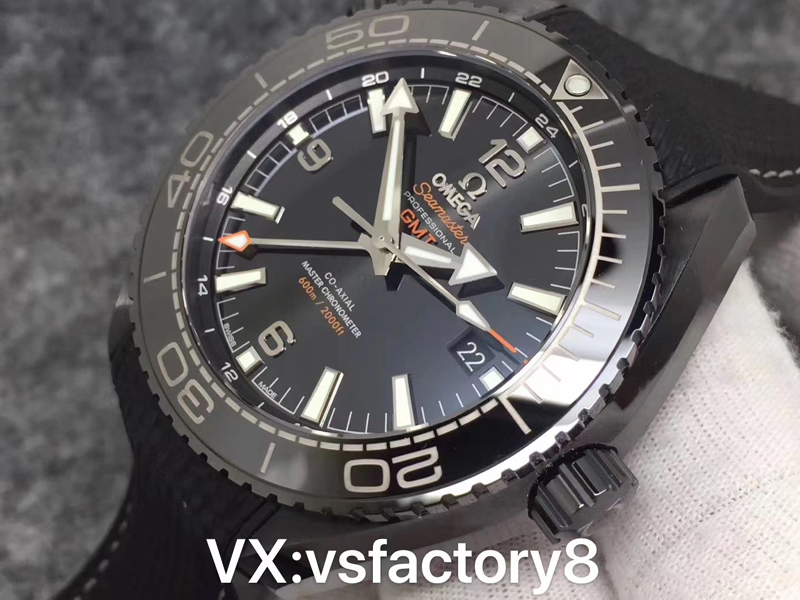 4:VS廠歐米茄深海之黑海馬600米的同步一致黑色的拋光陶瓷表盤復(fù)刻還原,時針、分針、秒針、GMT指針?biāo)尼樛S,指針和小時刻度經(jīng)過打磨圓潤,表盤的英文印刷細(xì)節(jié)做工也非常立體有質(zhì)感,指針和刻度均填充了瑞士夜光粉涂層,細(xì)節(jié)做工均勻,不溢出,夜光的顏色按照原版一致,真正達(dá)到了天花板級別的細(xì)節(jié)做工。