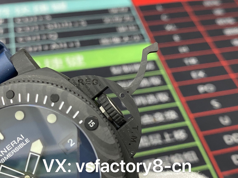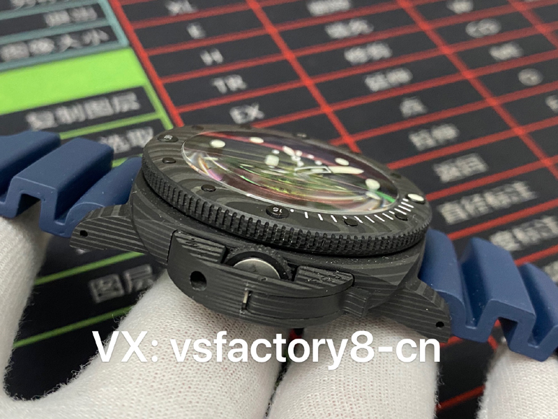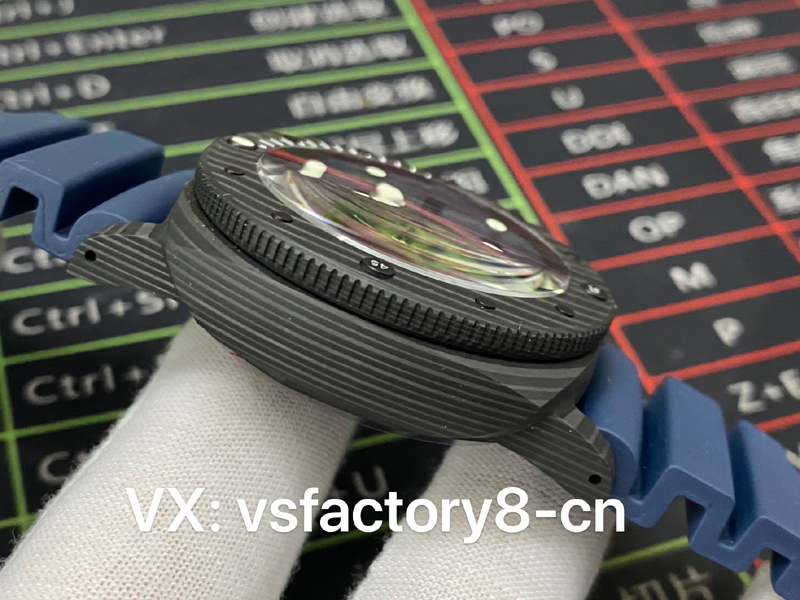 2:表圈復刻還原屬實精湛,VS廠深藍色沛納海pam1232復刻表的表圈采取了與表殼一致碳纖維材質鍛造,同步一致單向旋轉功能設計,表圈十二點位置設有夜明珠,立體潛水標志復刻一致到位,碳纖維表圈的紋路也根據(jù)原版復刻一致,彰顯了VS工廠匠心精神。