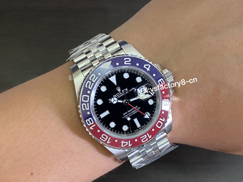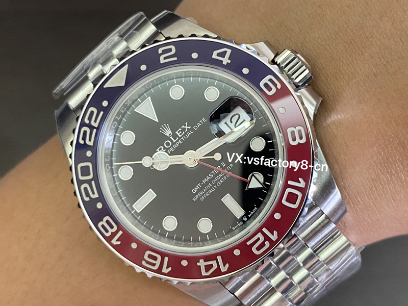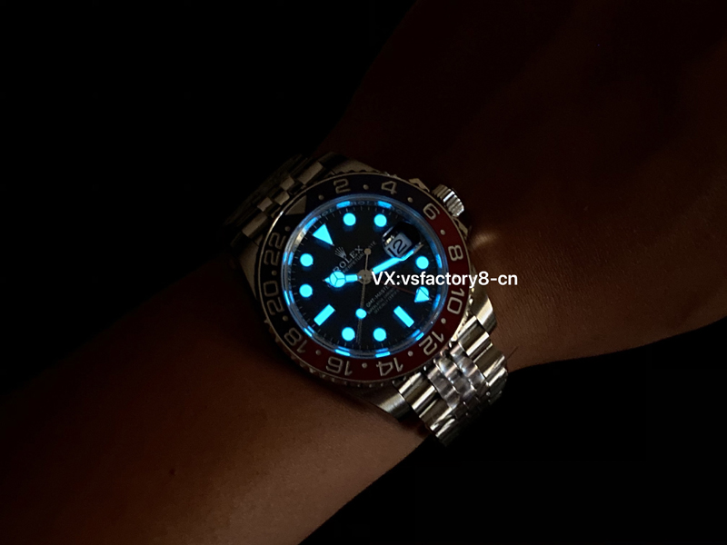 5:VS廠勞力士可樂(lè)圈的表盤(pán)使用了黑色搪瓷材質(zhì)鍛造,光澤感和質(zhì)感非常強(qiáng)烈,表盤(pán)上指針的造型、大小、刻度以及GMT針的復(fù)刻還原設(shè)計(jì),做到了一致,十二點(diǎn)大皇冠LOGO非常立體,表盤(pán)英文印刷字體細(xì)節(jié)非常細(xì)膩,無(wú)毛邊瑕疵現(xiàn)象,指針和刻度均填充了瑞士夜光粉涂層,效果顏色做到原版一致。