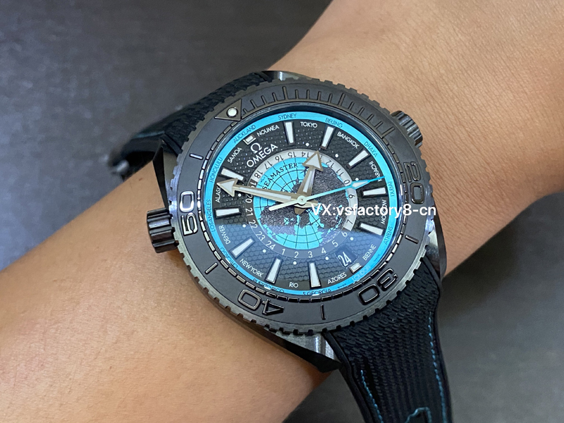 4:表盤的細(xì)節(jié)復(fù)刻還原非常精湛,VS廠入手的原版正品進(jìn)行開版開模,勵(lì)志達(dá)到原版一致細(xì)節(jié)做個(gè)品質(zhì),而表盤同步了原版一致黑色還原,表盤外側(cè)采用激光燒蝕技術(shù)打造蜂巢紋理,經(jīng)黑色 DLC 工藝和拋光處理后,極具質(zhì)感,綠松石色漆面外圈環(huán)繞表盤,其上印有世界各地的城市,表盤中央的內(nèi)表盤細(xì)節(jié)之中。運(yùn)用激光燒蝕與漆面處理工藝,更以匠心獨(dú)運(yùn)的巧思,完美VS工廠對(duì)歐米茄追求卓越的復(fù)刻表工藝水準(zhǔn),同時(shí),表盤各方面英文印刷字體非常細(xì)膩,指針和刻度打磨圓潤(rùn),均填充了瑞士夜光粉涂層!