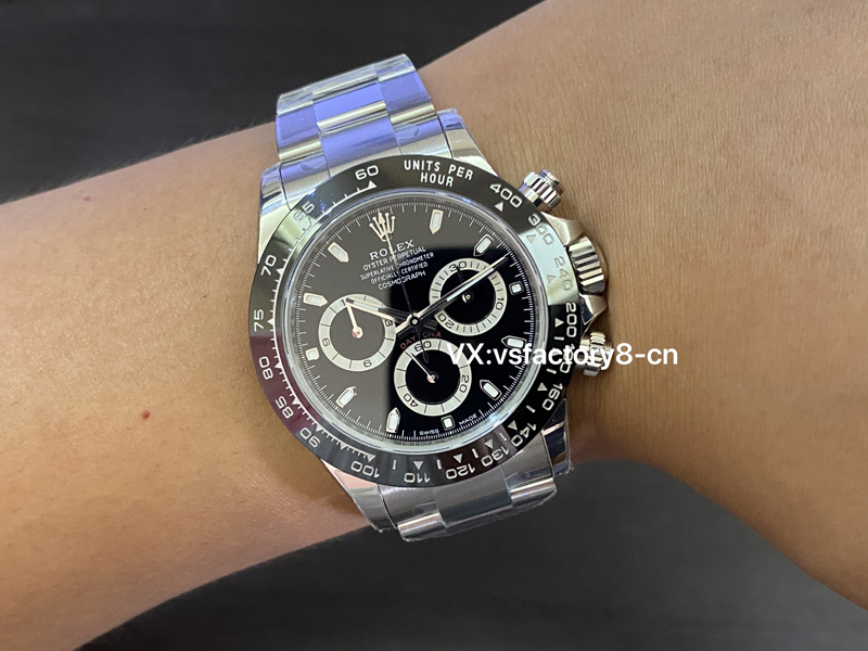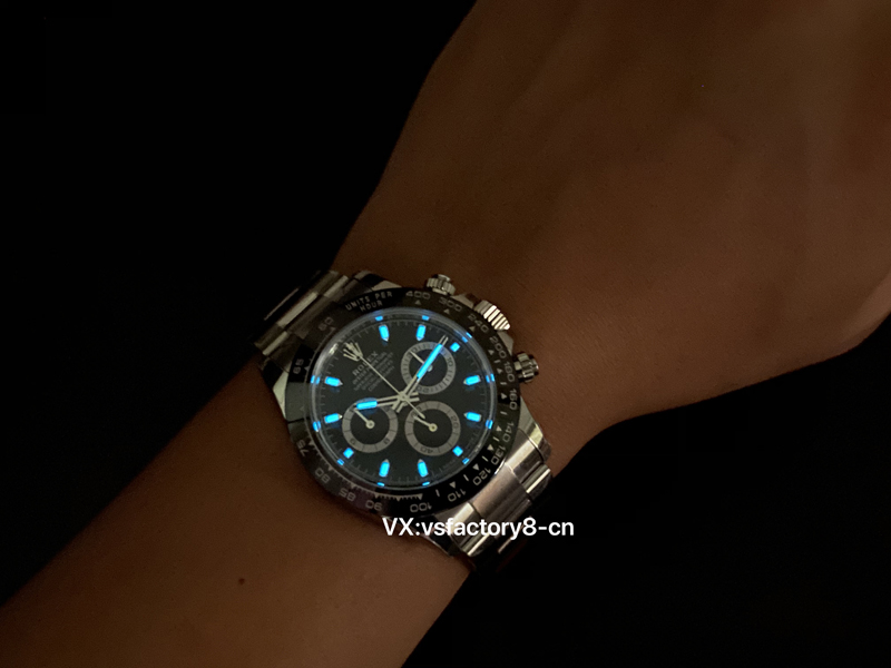 4:VS廠勞力士迪通拿黑陶迪的表盤復(fù)刻還原設(shè)計最高,同步一致黑色搪瓷材質(zhì)鍛造,搭載了細(xì)膩的白色計時圈,形成了鮮明的對比,使得視覺效果極其出眾。雖然是復(fù)刻表,但是每個細(xì)節(jié)都力求完美,表盤的三、六、九點位置,表盤上的指針與時標(biāo)均經(jīng)過拋光處理,光澤感極佳,VS廠更是細(xì)致到每個小刻度的刻畫,讓人難以分辨與正品之間的差距。