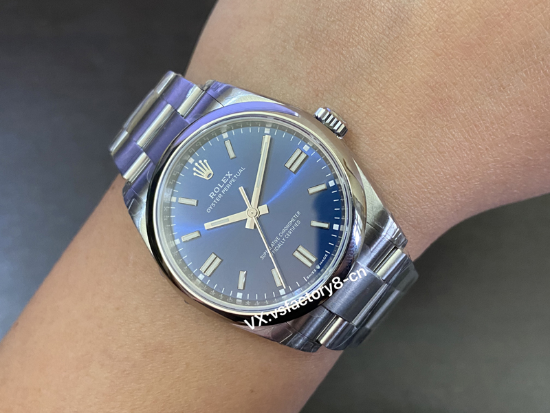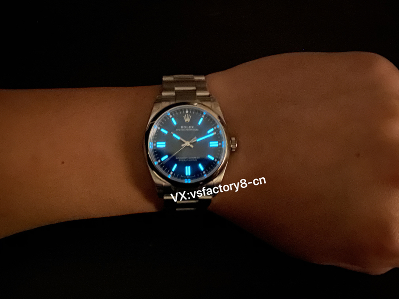 4:VS廠在勞力士蠔式恒動復刻表同步原版一致藍色表盤還原設計,藍色的表盤在光線的折射下閃耀著迷人的光澤,奔馳針設計,刻度和指針邊緣均經過打磨圓潤,十二點位置大皇冠LOGO,立體感強烈,細長的時針和分針搭配著的纖細秒針,使得整個表盤的視覺效果尤為協(xié)調,均填充了瑞士夜光粉涂層,細節(jié)均勻,夜光顏色同步原版一致。