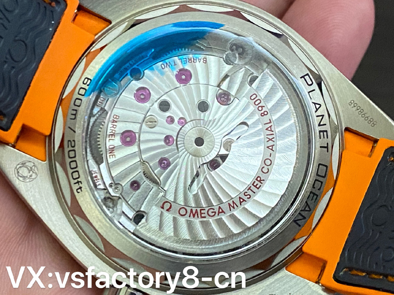 6:VS廠歐米茄灰色四分之一橙海馬600米復(fù)刻表搭載了丹東廠自主研發(fā)的8900一體機(jī)芯,丹東8900機(jī)芯的運(yùn)行精度高,日差在±5秒之內(nèi),機(jī)芯的振頻為28800次/小時(shí),確保了計(jì)時(shí)的準(zhǔn)確性,此外,丹東8900一體機(jī)芯的打磨工藝精細(xì),能夠在觀察透底時(shí)呈現(xiàn)出美麗的飾紋,彰顯出一款最高版本復(fù)刻表應(yīng)有的面貌。