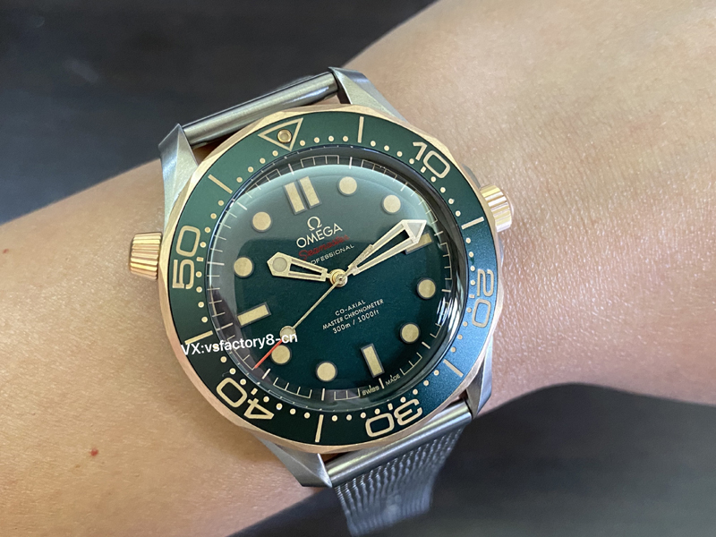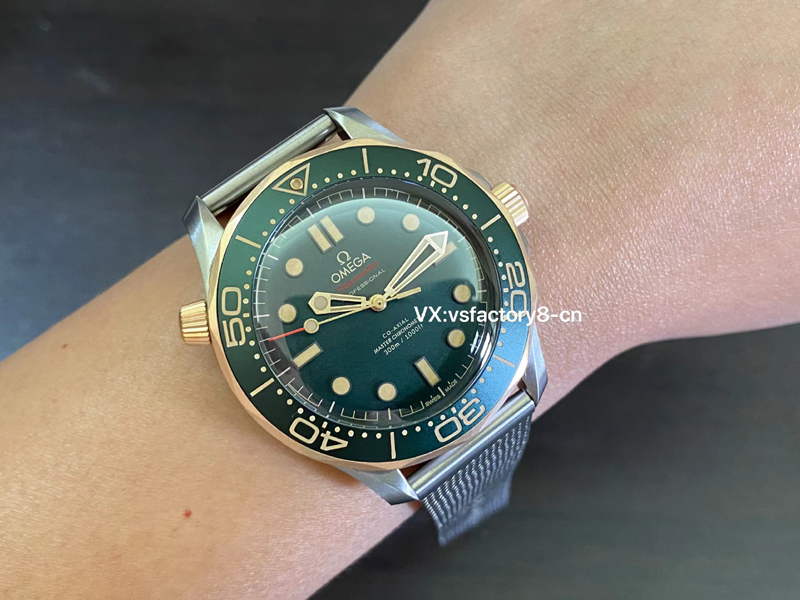 4:VS廠的這款歐米茄復(fù)古綠面無(wú)暇海馬300米復(fù)刻表,在表盤顏色的還原上可謂別出心裁,表盤采用了表圈一致從綠色,表盤?以噴砂工藝營(yíng)造漸變霧面質(zhì)感,最大限度減少反光,表盤的涂層工藝經(jīng)過(guò)精心打磨,確保了在光照下的色澤變化,搭配著玫瑰金的時(shí)標(biāo)與指針,同時(shí)也進(jìn)行了瑞士夜光粉涂層,表盤上的字樣也經(jīng)過(guò)精細(xì)的還原處理,字體形狀和間距都與原版保持一致,讓人毫無(wú)違和感。