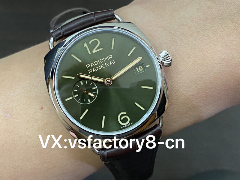 4:VS廠沛納海PAM1386的表盤還原設計非常高,采取了原版一致放射紋綠色表盤還原,而這一點也是VS工廠真正的做到對版表盤顏色,綠色的底盤上點綴著明亮的夜光刻度和時針、分針,指針采用了經(jīng)久耐用的瑞士夜光材料,夜光效果顯著,三點則是日歷窗,九點則是小秒針盤,表盤“三明治”結構復刻到位,其表盤英文印刷字體非常立體,看得出VS廠對此款復刻表的細節(jié)做工質量達到了天花板。