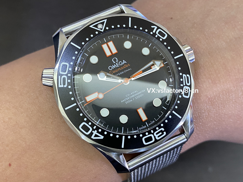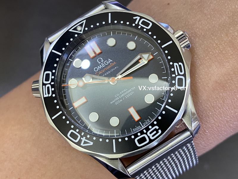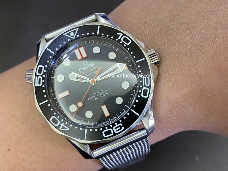 4:VS廠歐米茄無(wú)暇黑橙針海馬300米在表盤(pán)上保留了原版一直做工細(xì)節(jié),表盤(pán)采取了原版一致黑色鋁制復(fù)刻還原,中央秒針覆橙色亮漆,3 點(diǎn)、6 點(diǎn)、9 點(diǎn)、12 點(diǎn)時(shí)標(biāo)亦以橙色勾勒,與黑盤(pán)形成強(qiáng)烈對(duì)比,“Seamaster” 字樣同樣采用橙色,表盤(pán)上的時(shí)標(biāo)和指針都有瑞士夜光粉處理,不僅增強(qiáng)了其質(zhì)感,也提高了在水下環(huán)境中的可讀性。