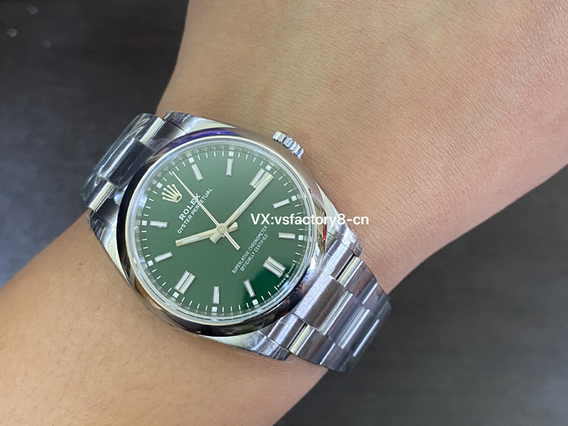 3:VS廠在勞力士蠔式恒動復(fù)刻表的表盤上真正高還原,采取了原版一致深邃的綠色顏色復(fù)刻還原,幾乎看不出色差現(xiàn)象,表盤采用飽和的綠色,光澤感十足,十分引人注目,十二點位置則是大皇冠LOGO還原,指針和刻度邊緣打磨圓潤,實心中軸,均填充了夜光粉涂層,并且表盤英文印刷上非常立體,確實是細(xì)節(jié)做工還原非常完美。