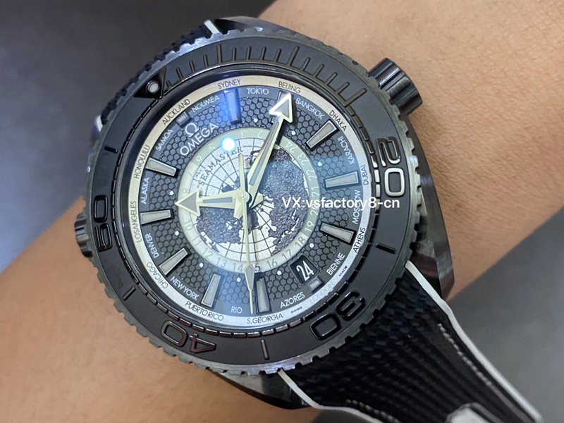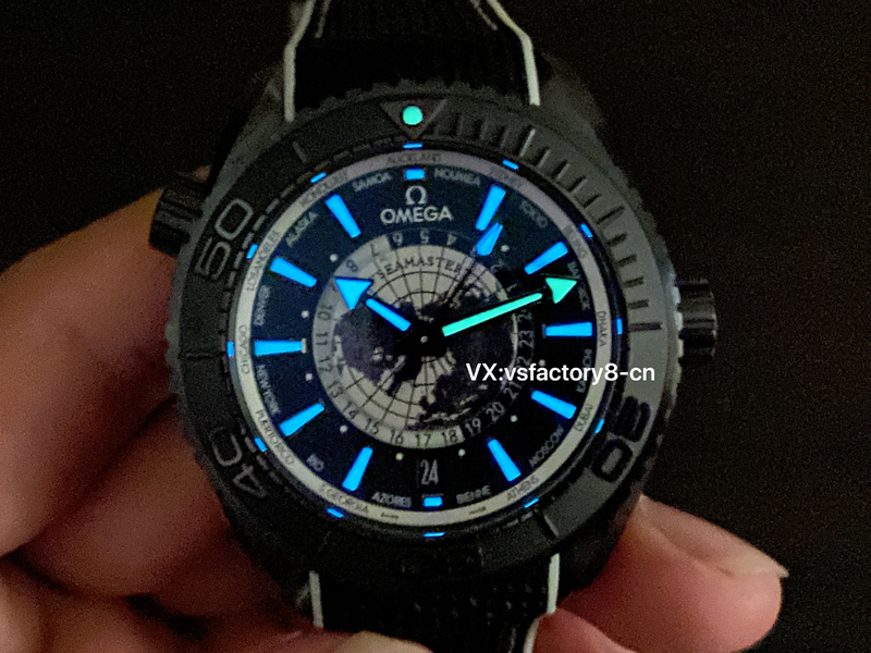 4:表盤方面也是很注重的方面,VS廠入手了正版開版制作,勵志同步一致工藝品質(zhì),采用正版一致獨(dú)特工藝塑造的蜂巢紋表盤,一致原汁原味還原,表盤采用鈦金屬激光雕刻地球影像,24小時刻度環(huán)以漸變灰區(qū)分晝夜,配合外圈世界城市名稱,實(shí)現(xiàn)瞬時時區(qū)讀取,搭配鉆石切割的立體時標(biāo),時標(biāo)和指針還原非常搞,經(jīng)過多次瑞士夜光粉處理,保證了夜間的發(fā)光效果,的確是很值得入手。