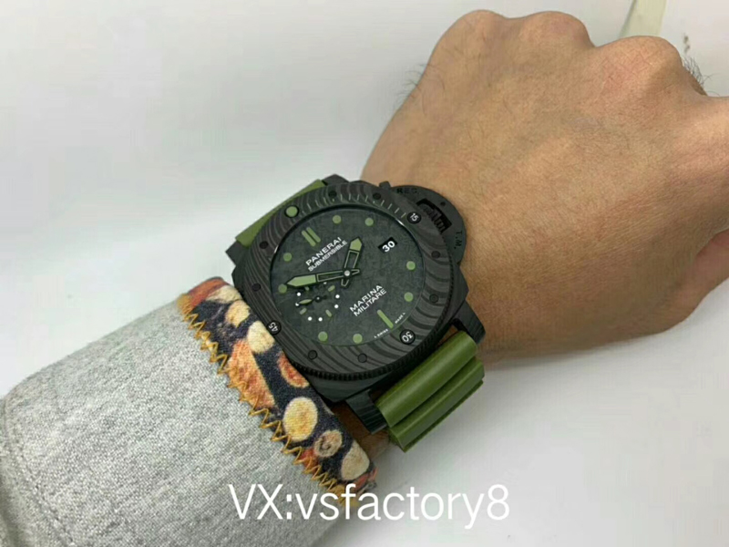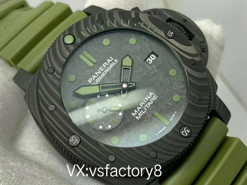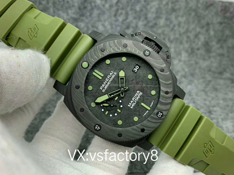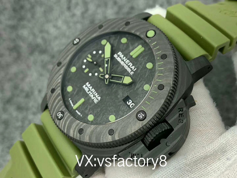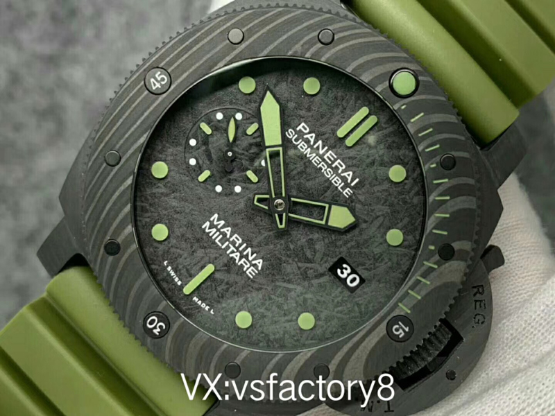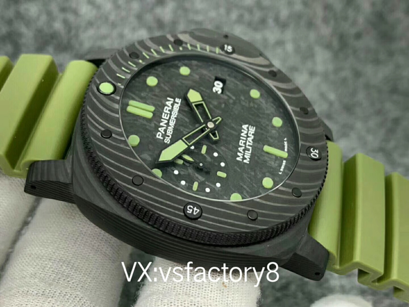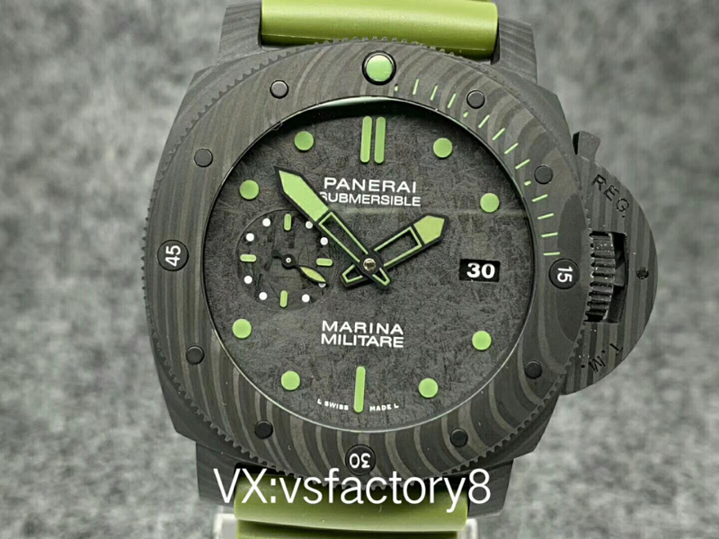 大理石花紋黑色碳纖?盤,深橄欖綠夜光時標、指針,天然橡膠表帶。