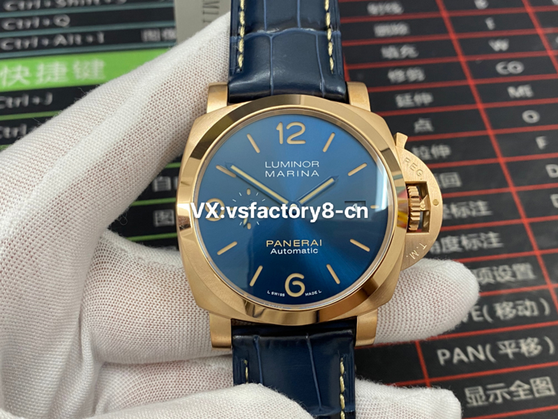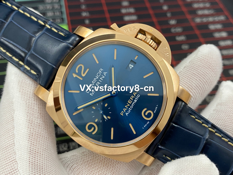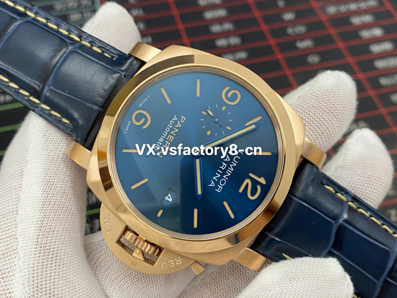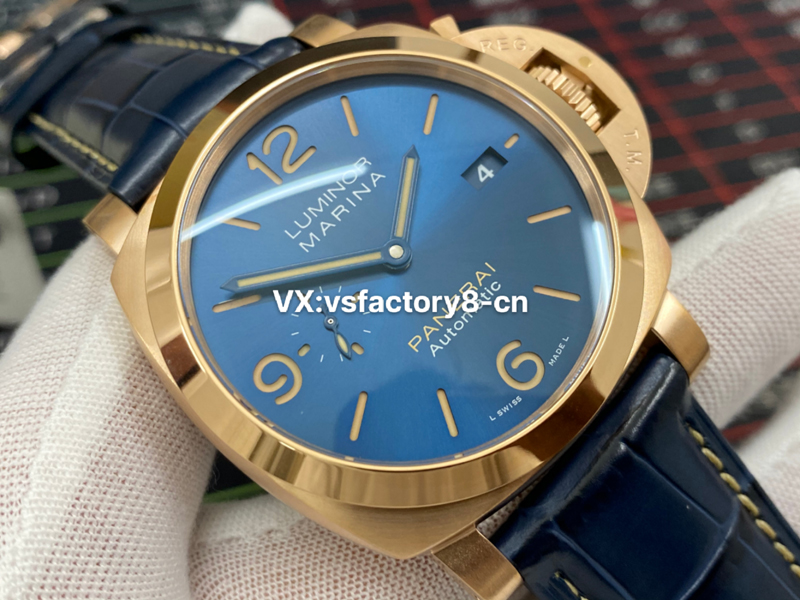 VS廠復(fù)刻表外觀其實(shí)跟其他沛納?;緵]什么區(qū)別,44mm的表徑,外觀也是精鋼進(jìn)行了真空電鍍,電鍍了18K金。