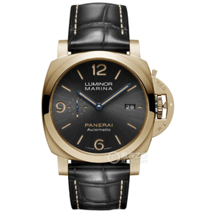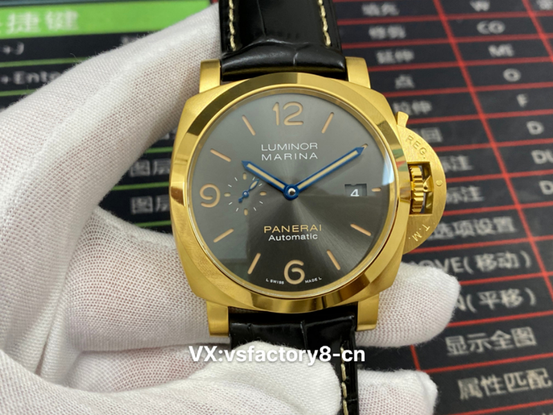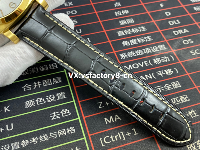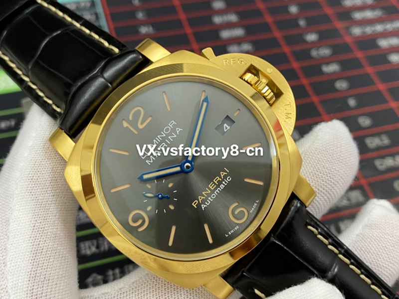VS廠復刻表外觀其實跟其他沛納?;緵]什么區(qū)別,44mm的表徑,外觀也是精鋼進行了真空電鍍,電鍍了18K金。