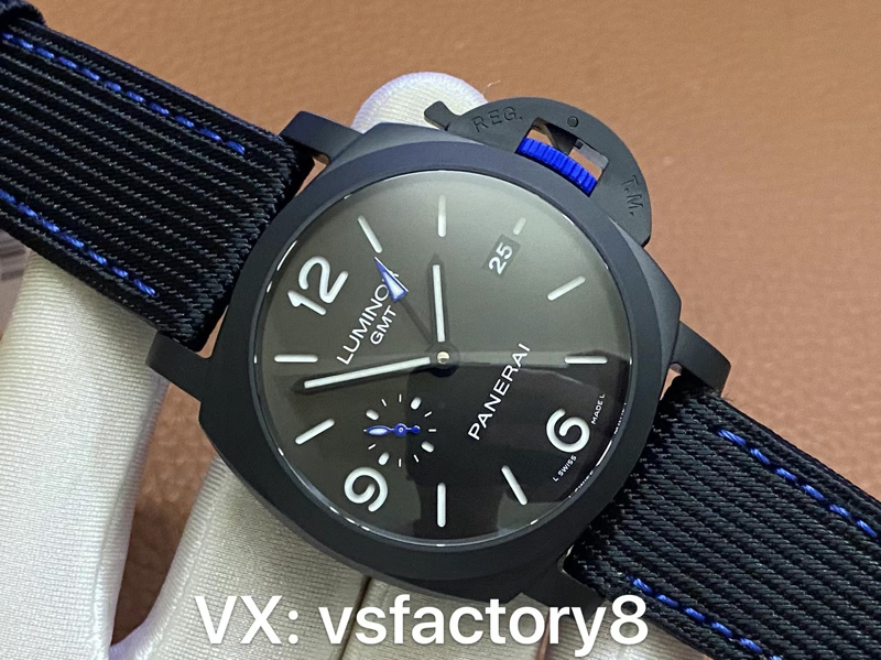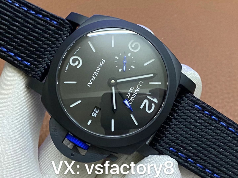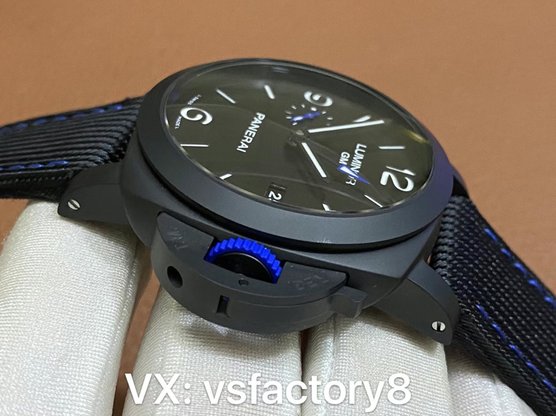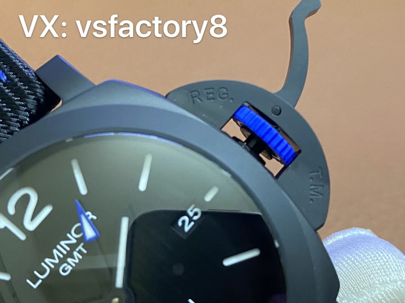 經(jīng)典藍(lán)色小秒針,藍(lán)色把頭,藍(lán)色的GMT針頭增加了VS廠沛納海1176的顏值美觀!