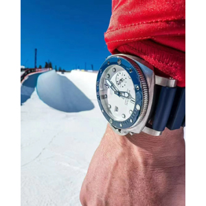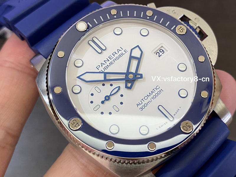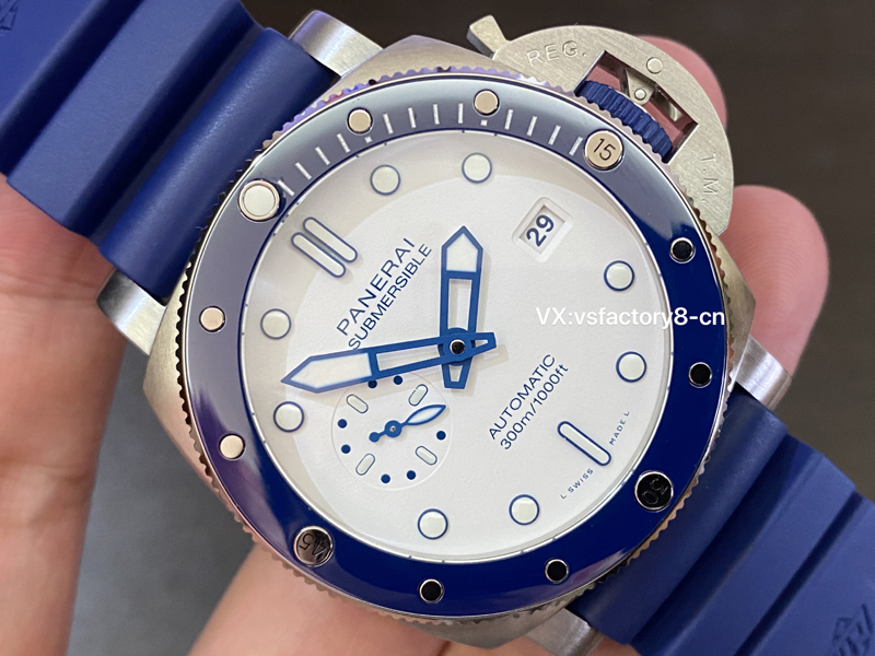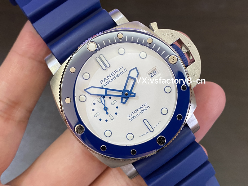 沛納海pam1696復(fù)刻表清爽的白色表盤(pán)點(diǎn)輟藍(lán)色元素,向白雪皚皚的山峰和神秘深邃的海洋致敬!