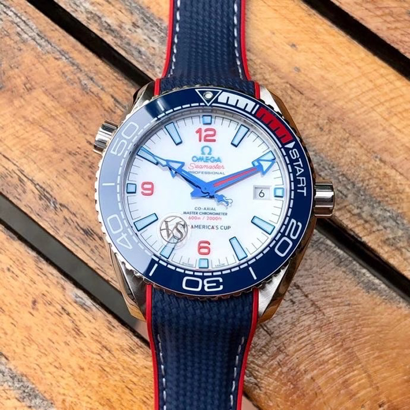 VS廠歐米茄43.5MM復刻表旨在致敬美洲杯帆船賽,歐米茄海馬表殼為不銹鋼材質打造,表圈的藍色則是藍色氧化鋯 (ZrO2) 也就是陶瓷表圈。