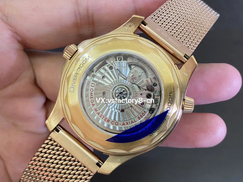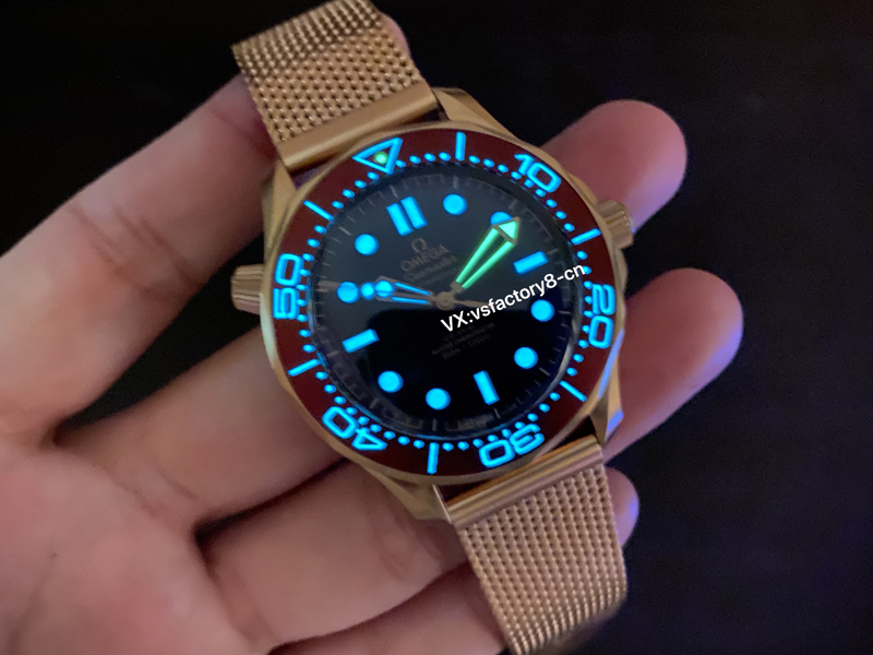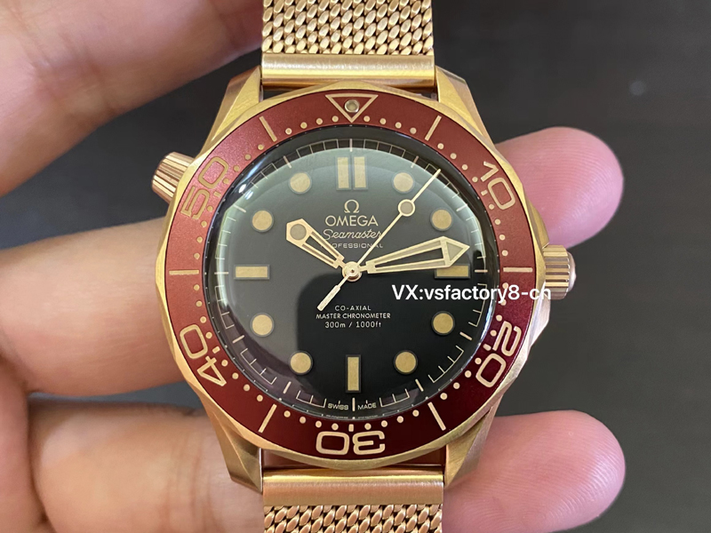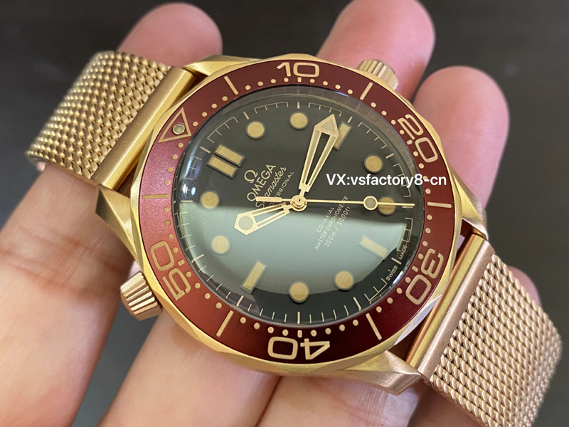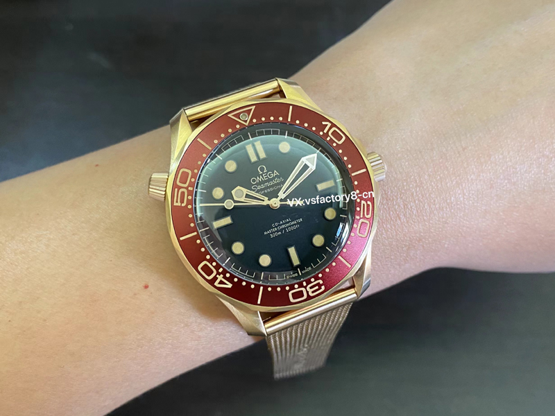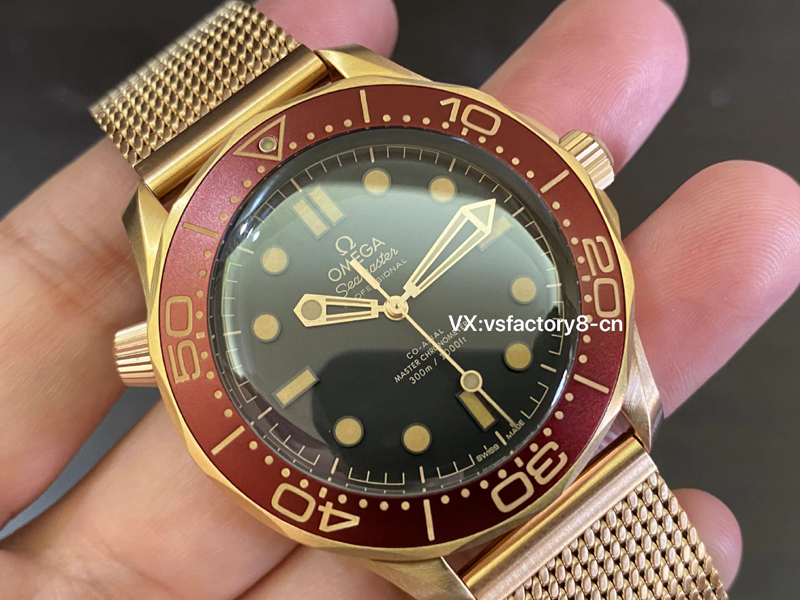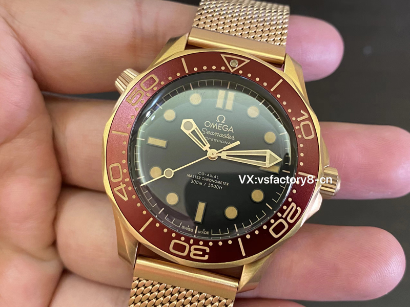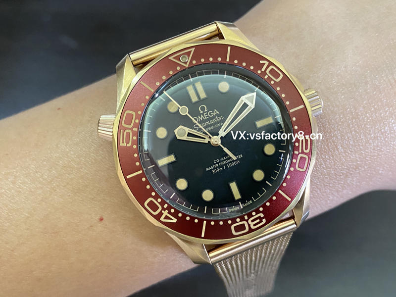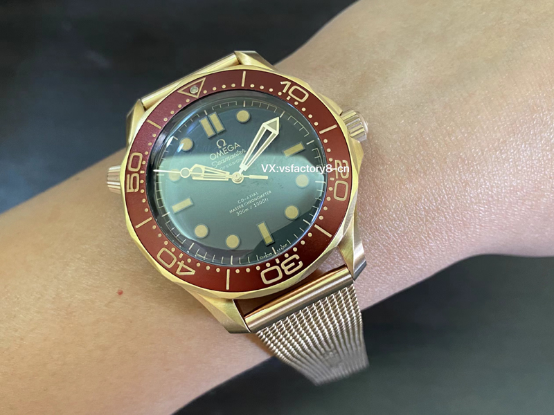 在外觀處理上,VS廠歐米茄海馬300米青銅金,整表全部拉絲。
