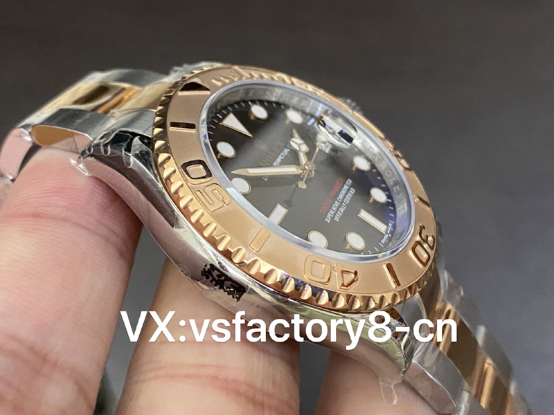 VS廠勞力士游艇玫瑰金巧克力復(fù)刻表的表殼側(cè)面纖薄修長、拋光效果閃耀靚麗,鎖頭護(hù)肩凹凸有致線條堅(jiān)挺柔和;