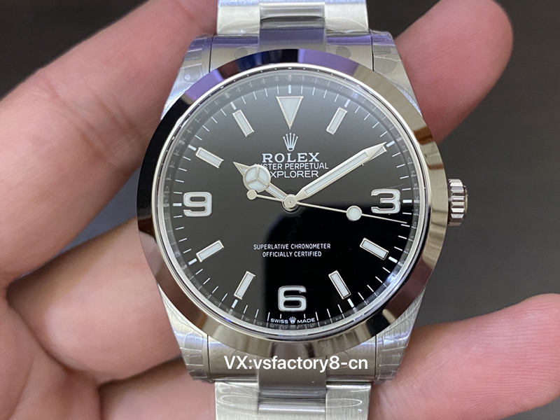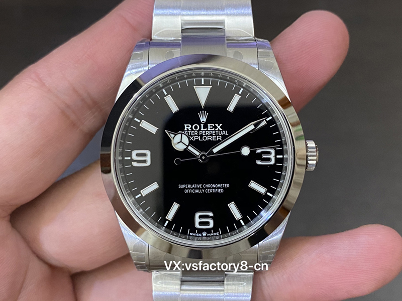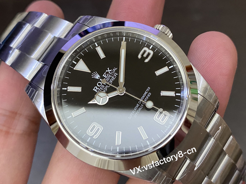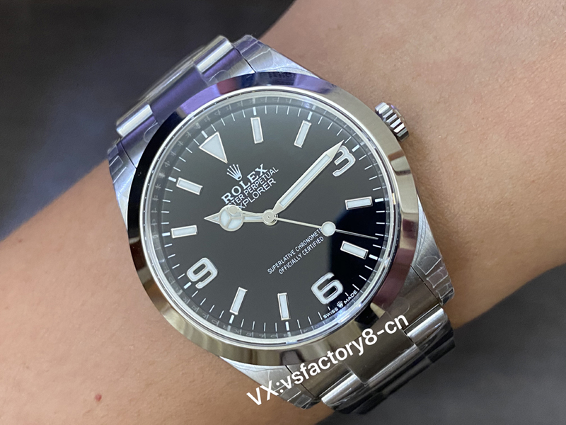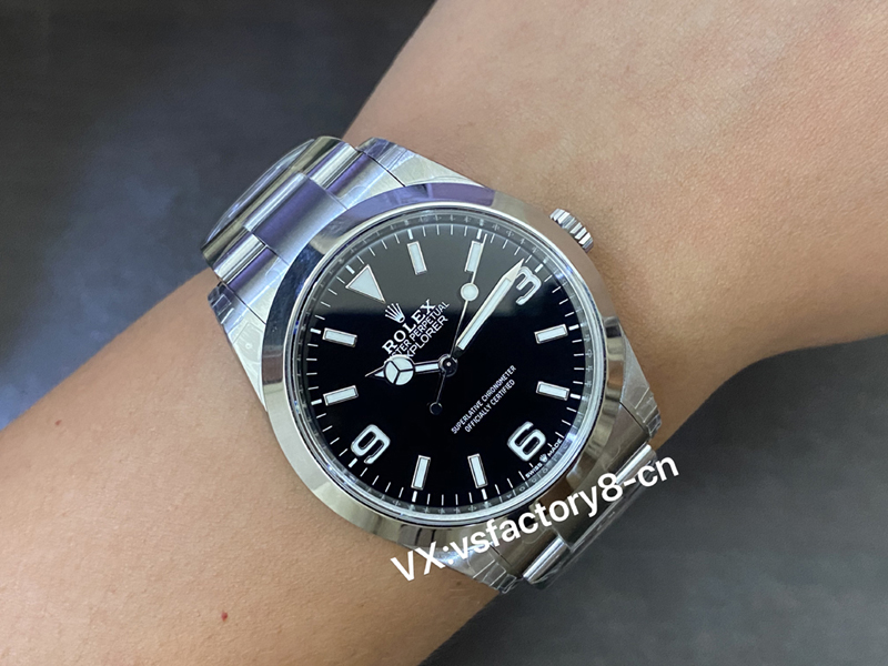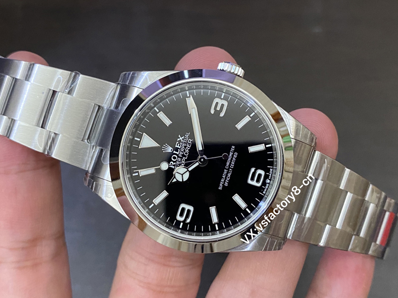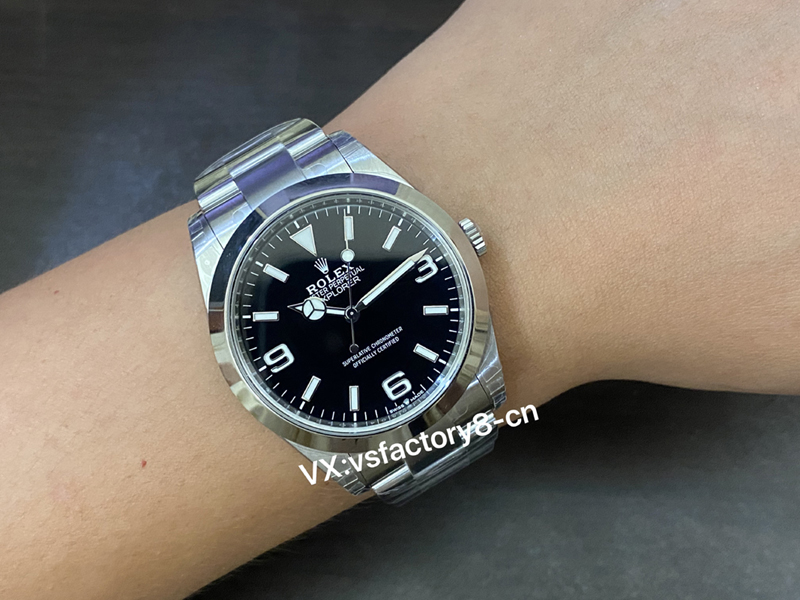 從外觀上看,VS廠勞力士探險家使用經(jīng)典素雅的黑色盤面,指針為勞力士著名的“奔馳針”,這種指針樣式具有很高辨識度。